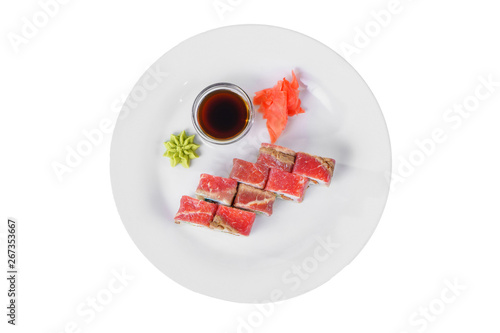 Oscar Style Surf And Turf Roll Crab Uramaki With Beef Carpaccio Sauce Is Lemon Tarragon Aioli Micro Radish Sushi