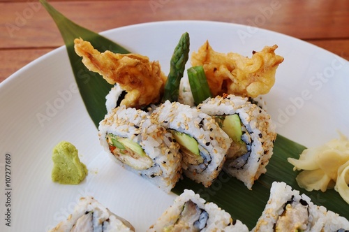 Tempura Maki Sushi Deep Fried Roll Made Of Crab Meat With Cucumber Served On Wooden Plate Sushi Japanese Cuisine Menu Stock Image Image Of Japan Crab 187993747