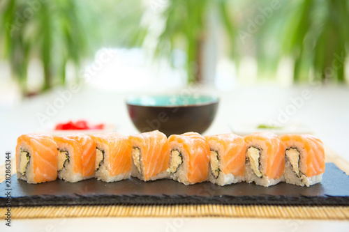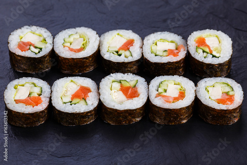 Appetizing Fresh Maki Sushi Roll With Salmon And Tofu Cheese Served On Black Slate Close Up Japanese Healthy Seafood Buy This Stock Photo And Explore Similar Images At Adobe Stock