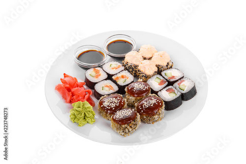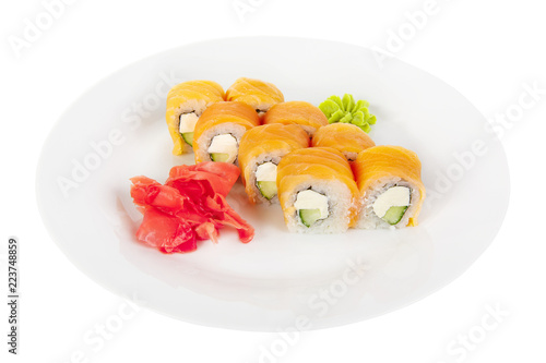 Sushi Rolls Uramaki Philadelphia With Salmon Avocado Cucumber Cheese Raw Seafood Soy Sauce Marinated Ginger And Wasabi Food On Plate White Isolated Background Side View For The Menu Buy This Stock