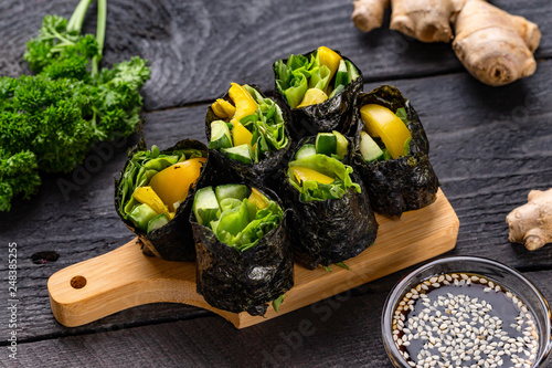 Set Of Healthy Vegetarian Vegetables Sushi Rolls With Cucumber Pepper And Green Salad At Decorated Wooden Table Background Buy This Stock Photo And Explore Similar Images At Adobe Stock Adobe Stock