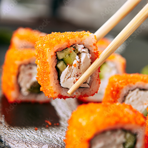 Chopstick Holding California Maki Sushi Rolls With Rice Cream Cheese Imitation Crab Meat Cucumber Orange Flying Fish Caviar And Nori Fresh Crab Roll On Black Stone Background Closeup Buy This Stock