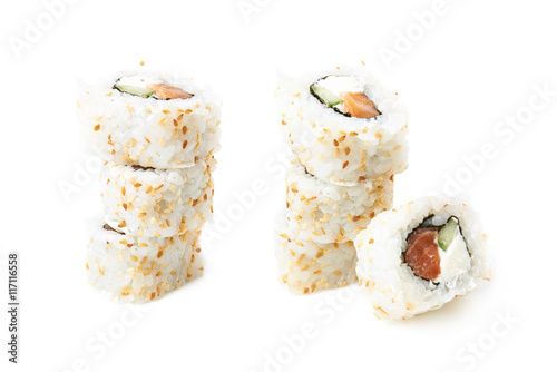 Uramaki Maki Sushi Two Rolls Isolated On White Philadelphia Cheese Nori Eel Seaweed Chuka Avocado And Tobico Royalty Free Images Photos And Pictures