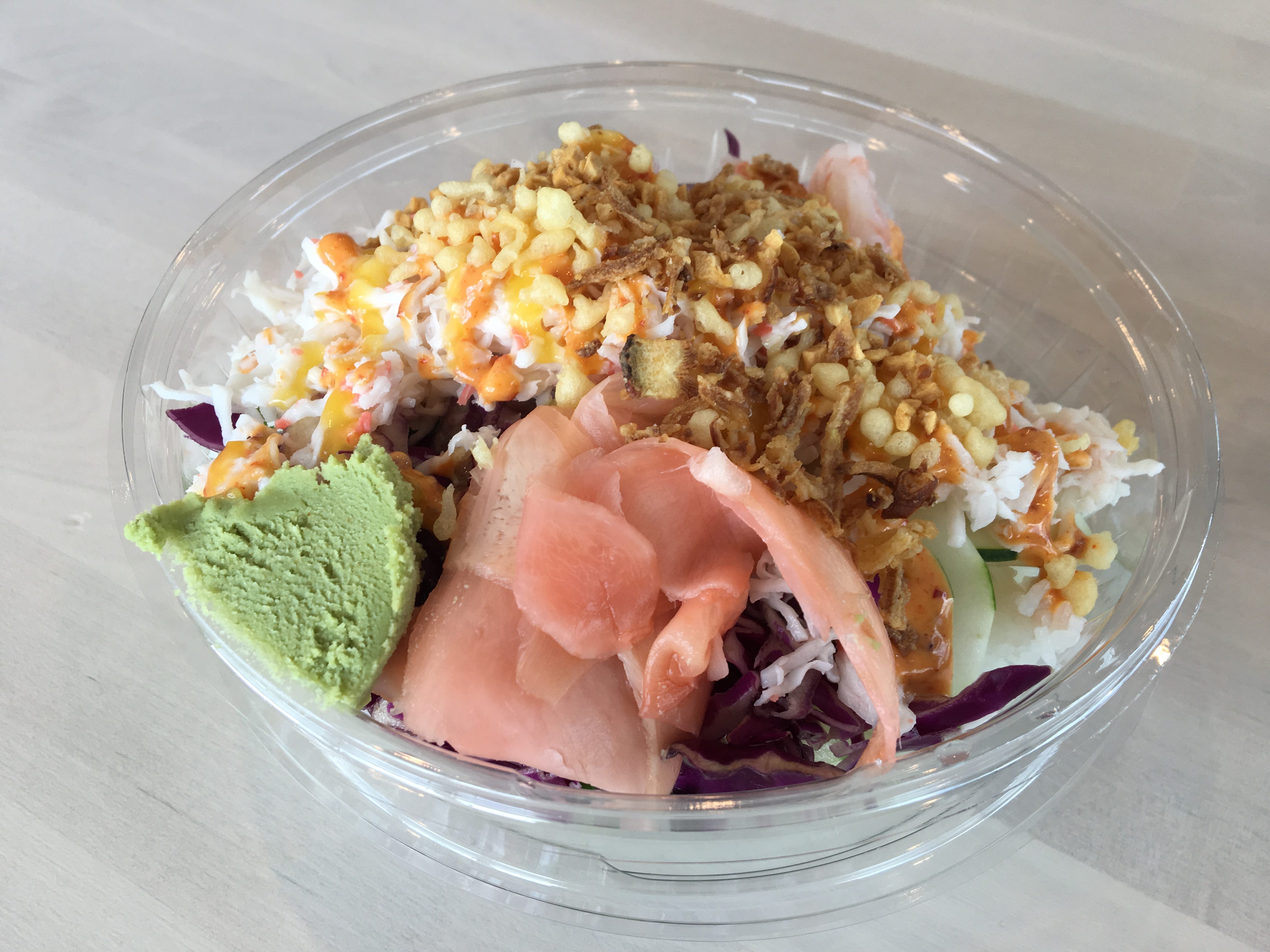 Poke Bowl With Egg Noodles Hibachi Chicken Avocado Sweet Onion Tempura Crisps With Wasabi Picture Of Suzaku Cafe Lynchburg Tripadvisor