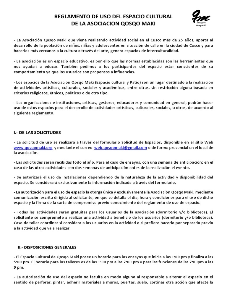Reglamento De Uso Del Espacio Cultural De La Asociacion Qosqo Maki Espacio Politica