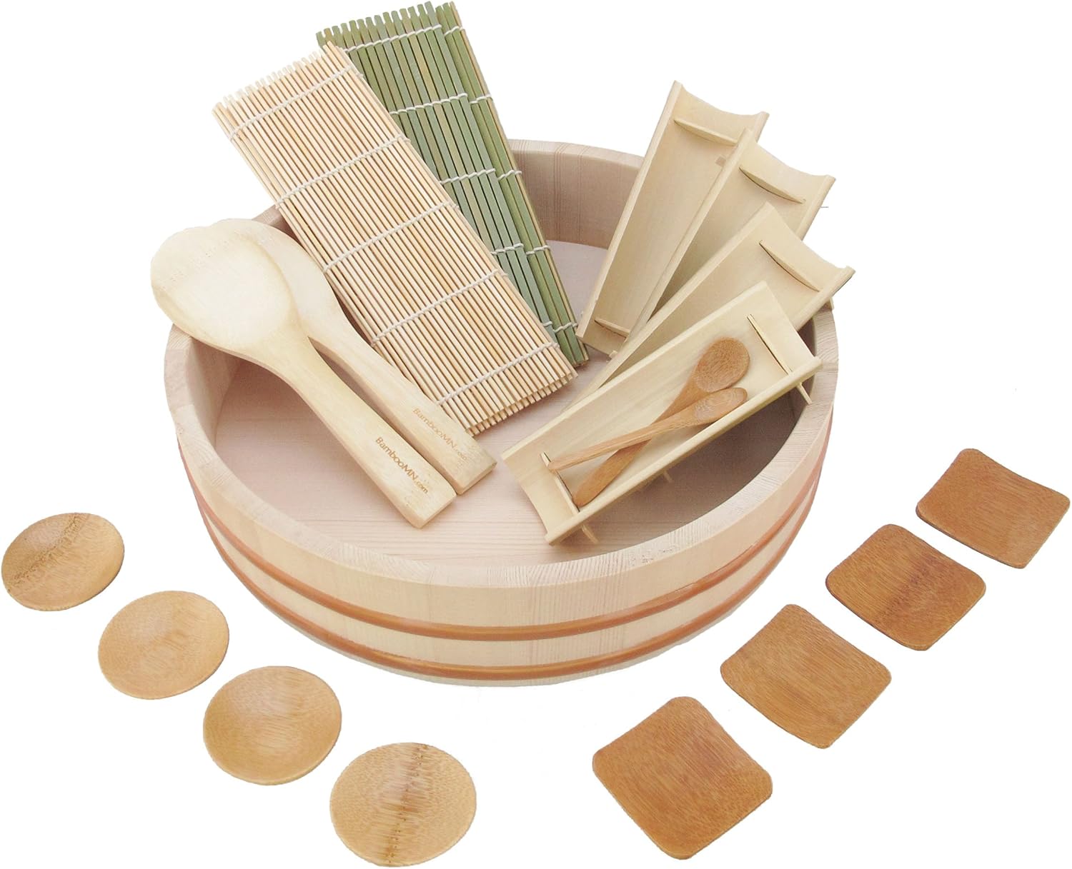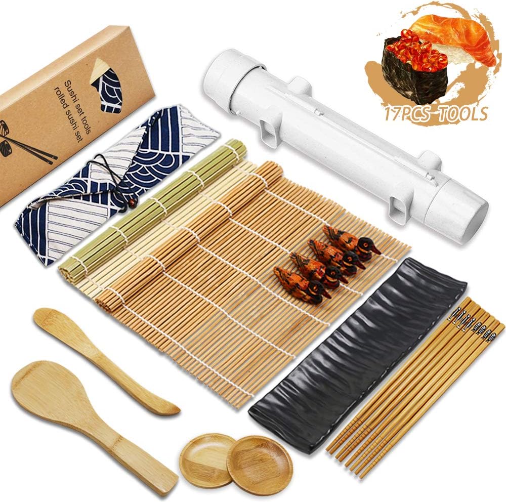 Amazon Com 17 Pieces Sushi Making Kit Bamboo Sushi Mat All In One Sushi Bazooka Maker Sushi Tools With Bamboo Mats Bamboo Chopsticks Paddle Spreader Dipping Plate Chopsticks Holder Cotton Bag Sushi