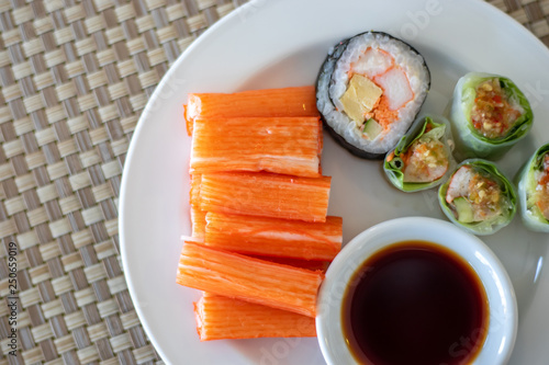 Fancy California Sushi Roll Topped With Sushi Sauce And Spicy Stock Photo Picture And Royalty Free Image Image 48075338