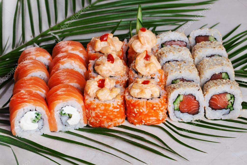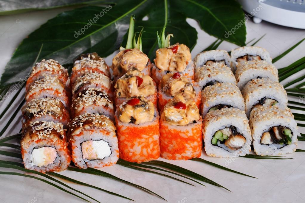 Sushi Roll Hot Appetizing Big Salmon Orange Sauce Kimchi Sesame Smoked Cucumber Tropical Leaf Palm Stock Photo Image Of Japan Meal 69232564