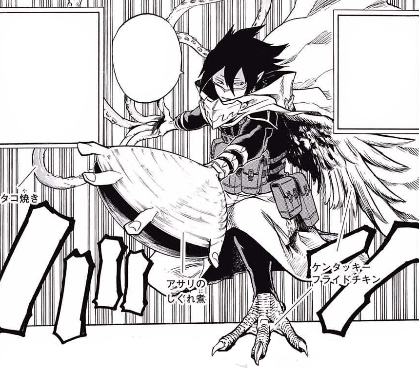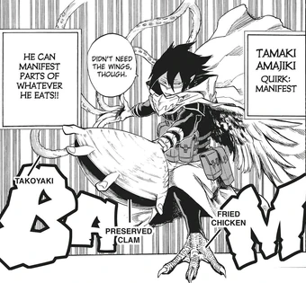 Tamaki amajikis quirk manifest is a transformative ability which allows him to manifest the characteristics of the food he eats. He has messy indigo hair which sticks out behind his head and thin tired looking eyes partially covered by his bangs despite the fact that theyre supposed to be split as to not impair his vision. His quirk also seems to push the foods characteristics to the max as eating kfc chicken wings gives him actual wings capable of flight despite chickens being unable to fly.