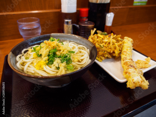 Wide Closeup Of Cold Tanuki Udon Noodles With Tempura Fried Chikuwa Fish Cake And Kakiage Vegetable Fritter At A Restaurant Ueno Tokyo Japan Travel And Cuisine Buy This Stock Photo And Explore