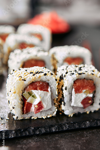 Uramaki Sushi Rolls With Fresh Salmon Avocado And Philadelphia Cheese Stock Photo Image Of Black Clients 54865558